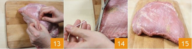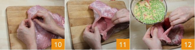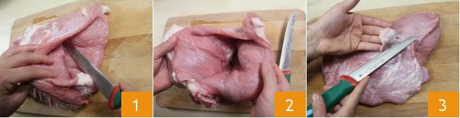 To prepare Cima alla Genovese, you will need to obtain a whole piece of veal breast and make a central and deep cut, keeping a distance of about 3/4 inch from the edges, with a long and sharp knife to make a pocket (1-2). If you can, have your butcher prepare the pocket for you. Trim the fat from the outside of the meat 3.