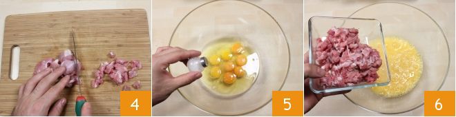 Cut the veal topside into cubes 4 and beat the eggs with a pinch of salt in a bowl 5. Add the cubed topside 6 and