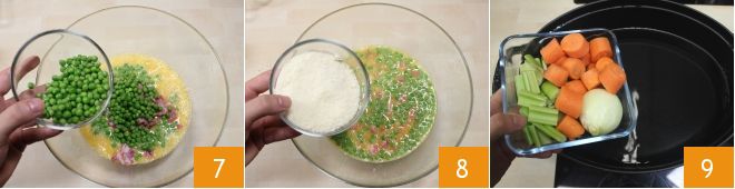 the pre-cooked peas, mix and finally add the grated cheese (7-8). Place a large pot on the stove with water and the cleaned and chopped onion, carrot, and celery to make the broth in which the cima will cook 9.