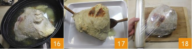 When the broth is boiling, salt the water and insert the well-closed pocket, which will need to cook for about 3 hours over low heat 16. After this time, drain it from the broth 17 and wrap it tightly in plastic wrap 18