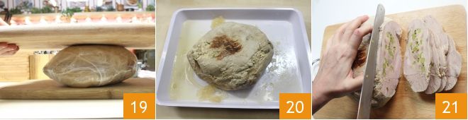 then place it on a tray and put a weight on top of it (we used a heavy cutting board) 19. The cima should rest this way overnight in the refrigerator: the next morning it will be well compacted and will have released the gelatin 20. Serve your Cima alla Genovese sliced 21!