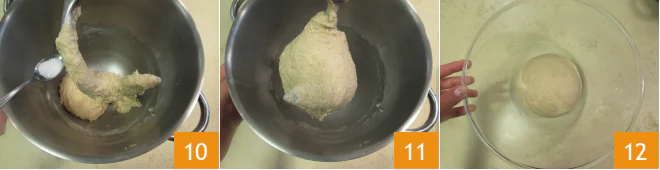 Finally, add the salt 10 and continue mixing until you have a well-combined dough 11. Transfer it to the work surface, round it into a ball, and place it in a bowl 12. Cover with plastic wrap and let rise at about 75°F for 1.5 hours.