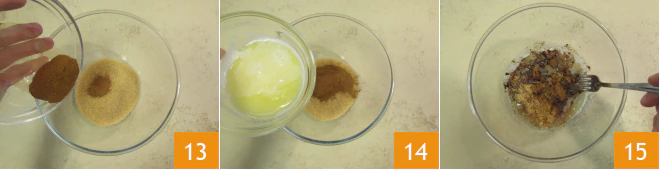 In the meantime, prepare the filling: melt the butter and let it cool slightly. Then add the brown sugar and cinnamon in a bowl 13. Add the melted butter 14 and mix the ingredients with a fork 15,