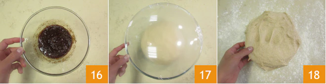 to obtain a homogeneous mixture 17 and transfer it to the refrigerator. Take the risen dough 17, place it on a floured surface 18
