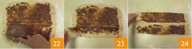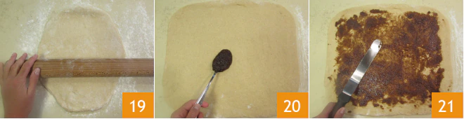and roll it out on the work surface 19 forming a rectangle about 16x14 inches. Spread the butter and cinnamon cream 20 over almost the entire surface, leaving only 0.4 inches free from the edges 21.