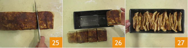 Cut squares about 3 inches each 25. Butter a slightly tapered loaf pan, measuring 10x4.5 inches at the top and 8.5x3 inches at the base. Place the squares inside 26, standing them vertically to fill it well 27.