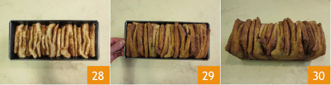 Let it rise in a sheltered place for 30 minutes 28, you can cover with a cloth. Bake in a preheated static oven at 340°F, on the middle rack, for 30 minutes (remember each oven is different, so the time may slightly vary). Remove from the oven 29 and let cool slightly before removing from the pan and serving your cinnamon pull apart bread 30.