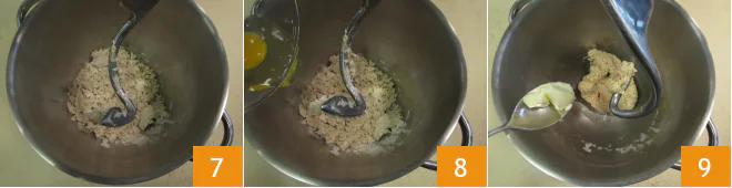 Mix the ingredients with the hook until you get a sandy mixture 7. Add the egg 8 and continue mixing until fully absorbed. At this point, add the softened butter a small piece 9 at a time, waiting for it to be well absorbed before adding more.