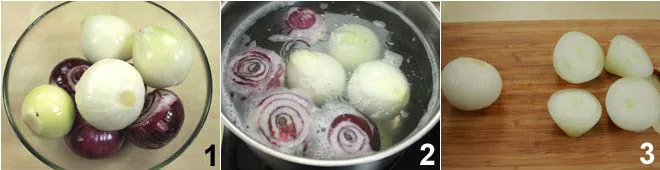 To prepare baked onions, start by peeling and cleaning the onions 1, then boil them for 7/8 minutes in plenty of salted water 2. Drain them and cut them in half with a sharp knife 3.