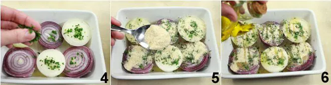 Grease a baking dish well and place the onions with the cut side up, season with salt and pepper, cover with plenty of chopped parsley 4 and sprinkle with breadcrumbs 5. Finish by drizzling with extra virgin olive oil 6. Bake at 350°F for 60/75 minutes until the onions are well cooked, wilted, and slightly charred (check the onions' doneness by piercing them with a wooden skewer).
