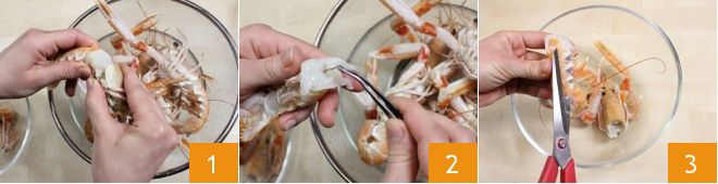 To make the classic puff pastry with sautéed scampi and balsamic, you must start by cleaning the scampi: first, wash the scampi thoroughly under cold running water, remove the head 1 and extract the intestine with the help of kitchen tweezers 2. Cut the lateral parts of the shell with scissors 3