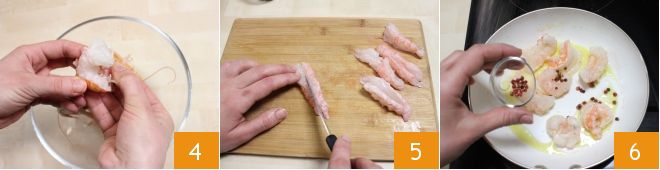 and remove the inside 4, this way you will keep the flesh whole. Make an incision on the back of the scampi 5. Place a pan on the heat with a drizzle of oil, add the cleaned scampi, add the pink pepper 6 and sauté them for 5 minutes,