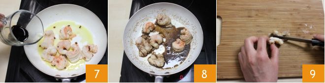 after this time, add the balsamic vinegar 7 and salt. Cook for another 10 minutes on high heat so that the sauce thickens 8. At this point, the scampi are ready, cut them in half 9