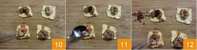 and start assembling the snacks: take a puff pastry, place half a scampi on top 10, further season with a few drops of balsamic vinegar 11 and the pink peppercorns 12. Your classic puff pastry with sautéed scampi and balsamic is now ready to be served!