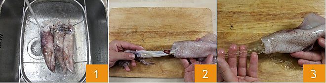 Cleaning fresh squid is a simple operation. All parts of the mollusk can be used, so once detached from the main body, keep them aside. Start by rinsing the squid under running water 1, then with your hands, gently detach the head from the mantle and set it aside 2. Once the head is removed, again with your hands, look for the transparent cartilage quill inside the mantle and gently remove it 3.