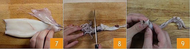 Pass the squid under running water once more, wash it thoroughly and use your hands to remove the innards from the mantle 4. If the squid has an ink sac and you want to use it in cooking, find the sac in the mantle cavity, drain the liquid and store it in a small bowl, while you can discard the innards. Then proceed to remove the outer skin: use a small knife to cut the end of the mantle just enough to grab a piece of the skin 5 and pull off the coating completely with your hands or with the help of a small knife 6.