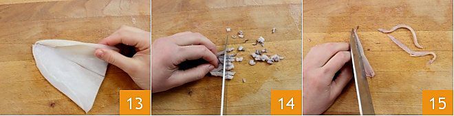 If, instead, you prefer stewed squid, you can open the mantle like a book: use a knife to cut the end and slide the blade along the entire length 13. The tentacles can be left whole or chopped to add them to the preparations 14. The fins can also be cooked: slice them into thin strips and add them to the recipe 15. The cooking times for squid depend not only on the usage but also on the size of the mollusk. It is advised not to cook squid for too long, to avoid it becoming rubbery.