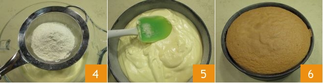 Sift both the flour and the cornstarch into the bowl of the stand mixer 4 and gently fold everything together with a spatula using upward strokes, so as not to deflate the mixture. Pour everything into the mold and use a spatula to level the surface 5. Bake the Sponge Cake in a preheated static oven at 320°F on the lowest rack for about 50 minutes (perform the toothpick test at the end of cooking to verify that the cake is well-cooked). Then take it out of the oven 6 and let it cool completely.
