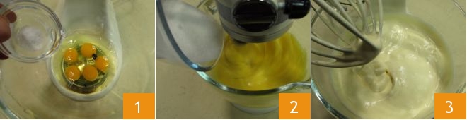 To make the cloud cake, first prepare the base by following our Sponge cake recipe. Pour the eggs into the bowl of a stand mixer fitted with a whisk attachment, add the seeds of the vanilla bean and a pinch of salt 1. Then start the mixer at medium speed and begin to work the mixture, slowly adding the sugar while the mixer is running: you should work the mixture for about 15-20 minutes 2. Meanwhile, butter and flour a 9-inch diameter cake pan and preheat the oven to 320°F in static mode. As soon as the mixture becomes fluffy and foamy, stop the mixer 3.