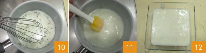 Mix everything with a hand whisk 10 to avoid forming lumps, and as soon as it starts to thicken, turn off the heat (or remove the pan from the heat) and stir vigorously with a spatula 11. Pour the cream into a bowl 12, cover with cling film in contact with the surface, and let it cool first at room temperature and then in the refrigerator.