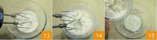 At this point, pour the fresh liquid cream into a bowl and whip it with an electric whisk 13 until stiff peaks form 14. When the milk cream is thoroughly chilled, add the whipped cream 15