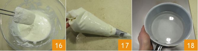 and gently fold it in with a spatula, always using upward strokes, until completely incorporated 16. Transfer the cream into a piping bag with a plain nozzle 17 and set it aside in the refrigerator. Now proceed with the preparation of the Swiss meringue, which will serve as the cloud cake's topping: fill a saucepan three-quarters full with water and heat it over low heat 18.