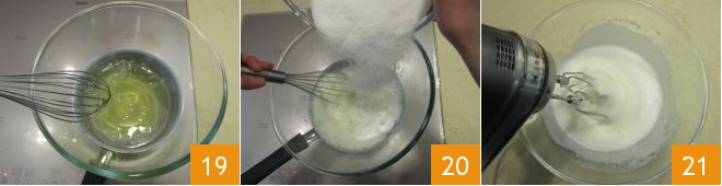 Place a bowl on top and pour in the egg whites 19; whisk the egg whites with a hand whisk, gradually adding the sugar 20. At this stage, it's necessary to use a food thermometer to monitor the temperature of the egg whites. Once the egg whites reach 140°F, remove the bowl from the saucepan, place it on a work surface, and continue to beat them with an electric whisk at medium and consistent speed 21 until cool.