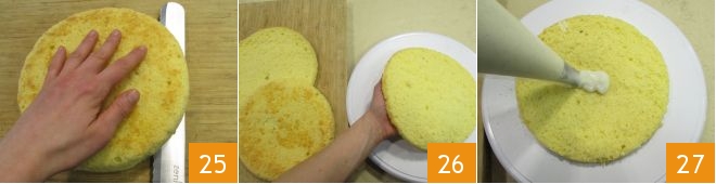 Then divide it into 3 equal discs: for this operation, we recommend consulting our guide How to cut Sponge Cake. With a long serrated knife, make a scoring along the circumference to define the first line to cut, then insert the knife and cut the first disc, trying to keep the blade always parallel to the base 25. Repeat this operation for the second disc. Place the base on a serving plate 26, fill the first layer with the milk cream 27
