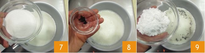 In the meantime, prepare the cream: pour the milk into a saucepan and heat it over low heat. Once hot and still on the burner, add the granulated sugar 7, the seeds of a vanilla bean 8, and the cornstarch 9.
