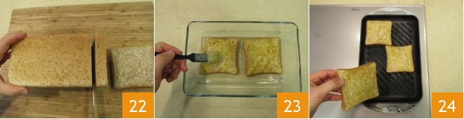 Prepare the bread: slice it to obtain slices weighing about 25 grams (0.9 oz) each, in total you should get 12 22. Brush with a little oil 23 and grill these too on a hot grill 34.