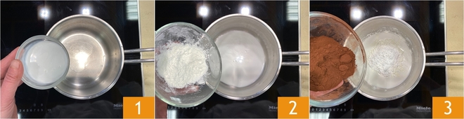 To prepare the mint and cocoa mousse, pour the coconut milk into a small saucepan 1, add the cornstarch 2 and the unsweetened cocoa powder 3.