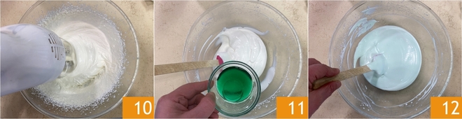 You should obtain a firm, stable consistency 10. Pour the mint syrup into the cream 11 and gently fold with a spatula, using upward strokes from the bottom, so as not to deflate the mixture and to keep a soft, airy texture 12.