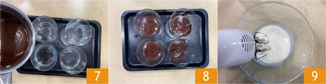 Divide the still-warm mixture into four small glasses 7 8, then transfer them to the refrigerator and let cool for 15-30 minutes, until the base is well set. At this point whip the well-chilled vegan cream 9.