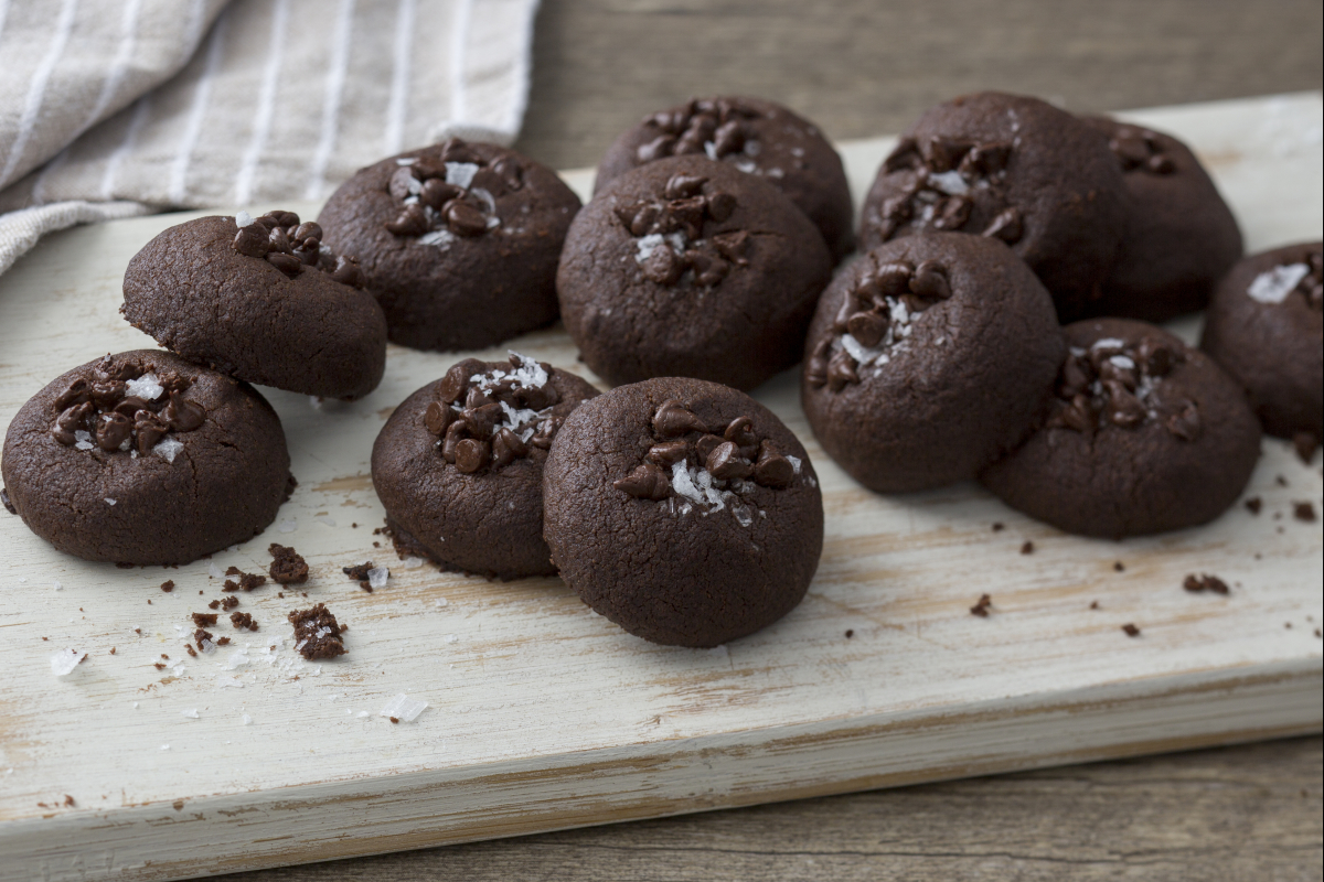 Decorate the surface of the cookies with the chocolate and fleur de sel 13. Bake in a preheated static oven at 356°F for about 18 minutes. Once baked, remove the cocoa cookies without eggs from the oven 14 and let them cool slightly before enjoying them 15.