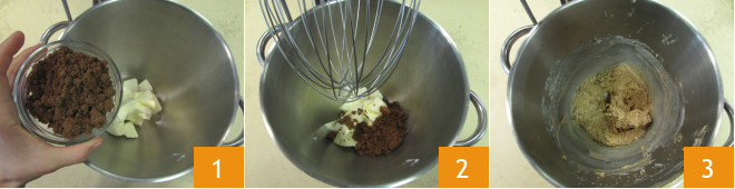 To make the cocoa cookies without eggs, place the room temperature butter and muscovado sugar in a stand mixer with a whisk attachment 1. Turn on the machine 2 and work everything until you get a homogeneous mixture 3.