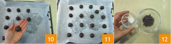 Take about 16/18 grams (0.56/0.63 oz) of dough, shape into balls with your hands 10, working quickly to avoid warming the dough too much, and place them on a baking tray lined with parchment paper 11; you will get about 35 cookies. In a small bowl, mix the chocolate chips with the salt flakes 12.