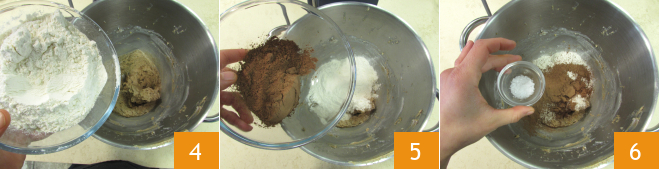 Incorporate the flour 4, cocoa 5, and salt flakes.