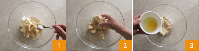 To prepare the cocoa tartlets with cream and blackberries, start with the shortcrust pastry. In a bowl, pour the butter, sugar, and salt 1. Work quickly with your hands until the ingredients are combined 2, and add the egg 3.