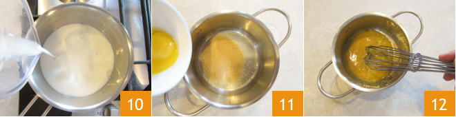 In the meantime, prepare the cream. Pour the almond milk into a saucepan 10 and bring it to a light boil. In another saucepan, combine egg yolks and sugar 11, then immediately mix with a whisk 12.