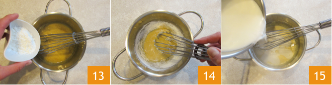 Add the cornstarch 13 and mix again with the whisk 14. Pour the hot milk into the egg mixture 15 and mix well, then return to the heat.