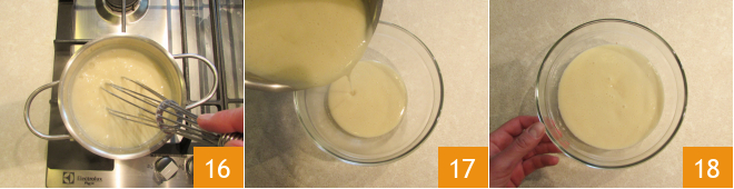 Continuing to stir 16 bring the cream to a boil. Pour the ready cream into a bowl 17 18 and cover with cling film in contact. Let it cool in the refrigerator for at least 1 hour 18.