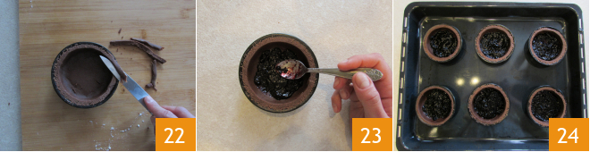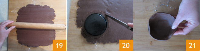 Roll out the pastry to a thickness of 0.2 inches 19. At this point, take 8 molds with a diameter of 3.14 inches at the base and 3.93 inches on the surface. Place an inverted mold on the pastry and cut out a slightly larger disc 20. Line the molds with the pastry discs by applying light pressure with your fingers 21.