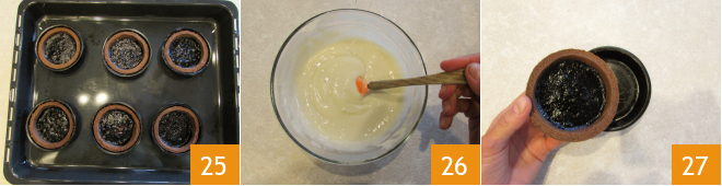 Bake the tartlets in a ventilated oven at 356°F for 20 minutes. Remove them from the oven and let them cool 25. At this point, take the cream from the refrigerator and work it with a spatula to make it creamier. Unmold the tartlets 27