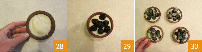 and pour the cream inside with a spoon 28. Slightly level the surface and decorate with fresh blackberries 29. Finish with mint leaves and a dusting of powdered sugar 30.