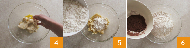Work again for a few seconds, still with your hands 4. When you have obtained a homogeneous mixture, add the previously sifted flour 5 and the cocoa also sifted 6.