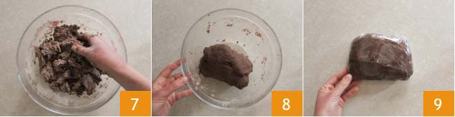 Work with your hands 7 until you get a homogeneous dough 8. Wrap it in plastic wrap 9 and let it rest in the refrigerator for 30 minutes.