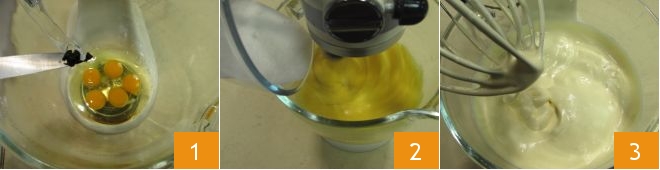 To prepare the coconut and lemon cake, start by making the Sponge cake. Transfer the eggs into the bowl of a stand mixer, add the vanilla bean seeds 1 and a pinch of salt, and start whisking at medium speed. Meanwhile, add the sugar slowly 2 and whip the eggs for about 15 minutes until they are thick and frothy.