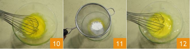 and quickly mix with a whisk 10. Sift the starch directly into the bowl 11 and mix again to combine the ingredients 12.