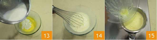 As soon as the milk is hot, pour it into the egg yolk mixture 13 and whisk quickly 14. Pour everything back into the saucepan 15