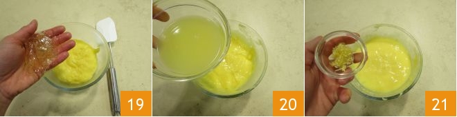 and add them to the cream 19, which should not be boiling but still warm. Then add the juice 20 and grated lemon zest 21.